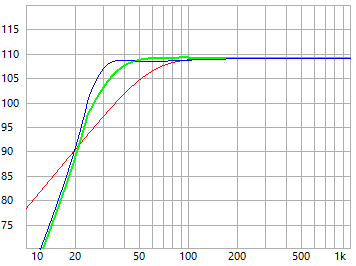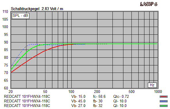 - beide Bassreflex-Abstimmungen können bis hinunter zu 30 Hz (blau) bzw. 38 Hz (grün) mindestens 107 dB Schalldruck produzieren, wobei dies durch die Eingangsleistung von max. 200 Watt begrenzt ist
