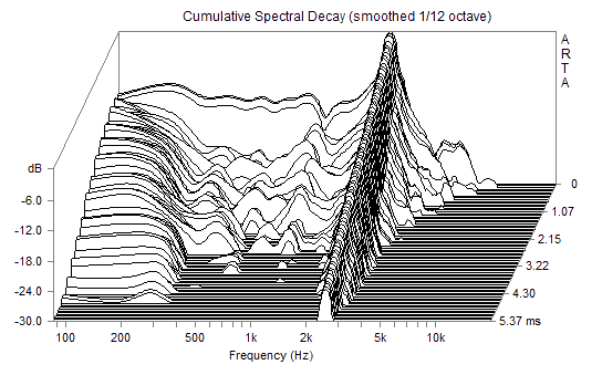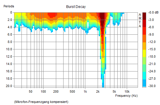 Beim periodenskalierten Zerfallspektren stört nur das lange Nachschwingen um die Membranresonanz von 2.6 kHz, ansonsten verhält sich das Chassis perfekt.