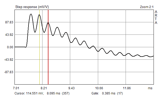Die Sprungantwort zeigt ein Ausschwingen auf der Membranresonanz von 2.6 kHz (Periodendauer 0.385 ms), das erst nach 6 ms weitgehend abgeklungen ist.