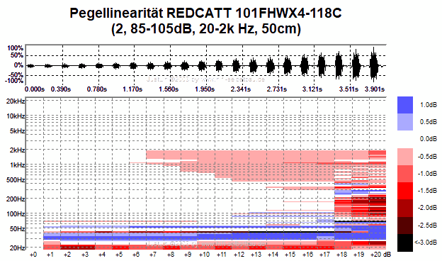 Bei einem Schalldruck von 85 bis 105 dB (das entspricht einer Anregung mit 2.2 bis 22 Volt bzw. 0.14 bis 140 Watt) zeigen sich bis 102 dB nur sporadisch Nichtlinearitäten > 0.5 dB. Bei höheren Pegeln steigen die Nichtlinearitäten dort an wo die Impedanz minimal ist - hier schwächelt offenbar schon unser Messverstärker wegen der niedrigen Impedanz (= hohe Ströme) . . .