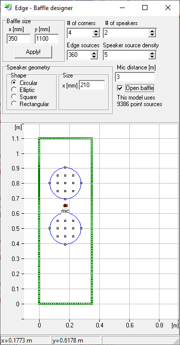 Fragt man das Programm Edge, so fällt der Frequenzgang von zwei 25 cm Tieftönern (effektiver Membrandurchmesser ca. 21 cm) auf einer 35 cm breiten und 110 cm hohen Schallwand bereits unterhalb von 200 Hz mit 6 dB/Oktave ab (rote Kurve):