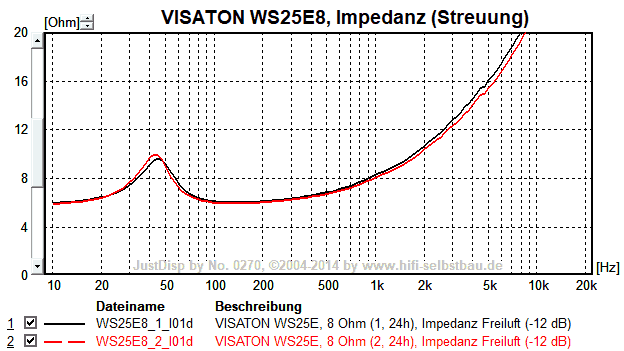 Die Streuung der TSPs ist noch gering. Die fehlenden Hinterlüftungsmaßnahmen bescheren dem WS25E eine mechanische Güte Qms von nur 1.89 - VISATON gibt 2.82 an. Die elektrische Güte Qes wird mit 2.81 ganz gut getroffen (VISATON: 2.92). Hier noch der Vergleich der anderen TSPs: