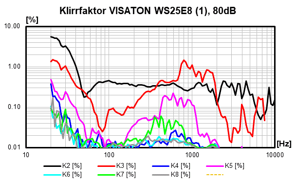 Die Klirrkomponente K2 verläuft oberhalb von 50 Hz weitgehend linear und steigt moderat mit dem Anregungspegel an. Der unharmonische K3 hat ein Maximum zwischen 700 Hz und 1.8 kHz (entspricht 1/3 des Bereichs der Membranresonanzen von 2.1 bis 5.4 kHz) und steigt etwas weniger als K2 mit dem Anregungspegel an. Für K5 gilt dasselbe zwischen 400 und 1100 Hz, für K7 von 300 bis 750 Hz. Ab 90 dB spielen auch K4 (520 bis 1350 Hz) und K6 (350 bis 900 Hz) eine Rolle.