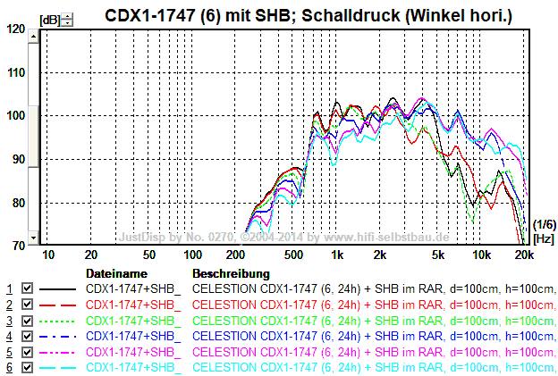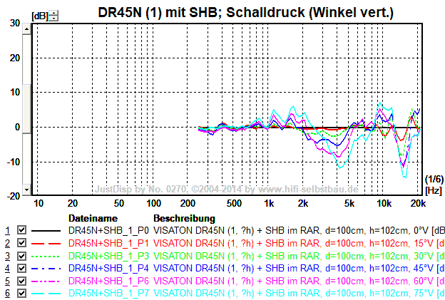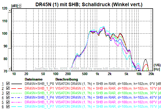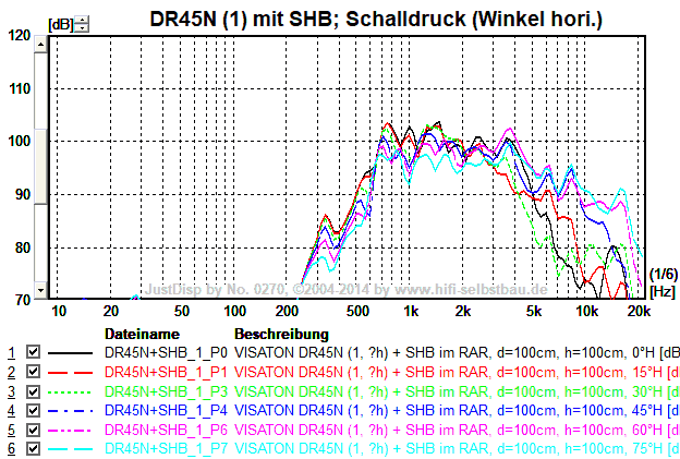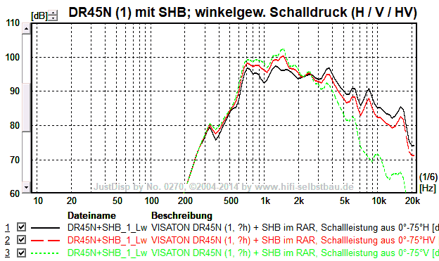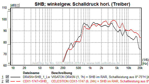 Betrachtet man den winkelgewichteten Schalldruck (horizontal) so zeigt sich, dass der CELESTION CDX1-1747 unten rum etwas leiser als der VISATON DR45N ist (ca. -3 dB), dafür liefert er oben rum mehr Schalldruck (ca. 5 dB):