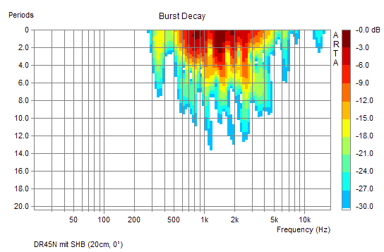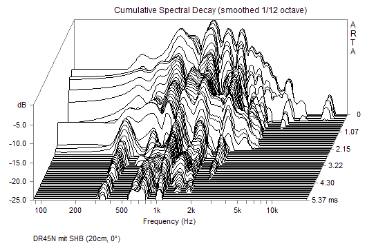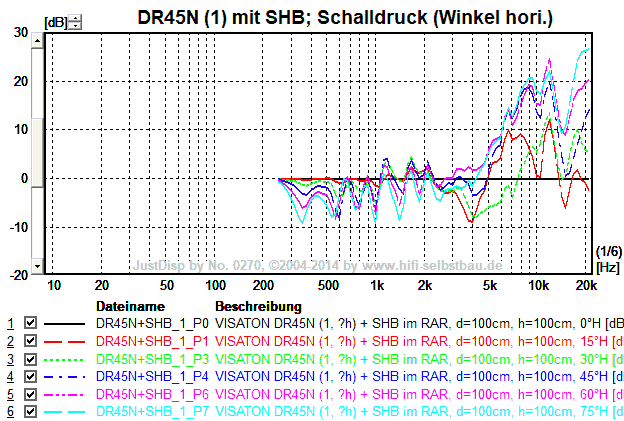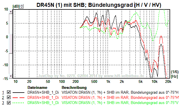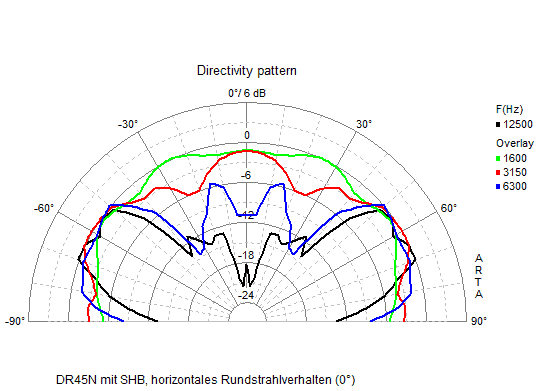 In horizontaler Richtung strahlt das schwarze Smith-Horn (kurz: SHB) bis 4 kHz extrem breit. Darüber wird der Schalldruck zu den Seiten des Horns (+/- 60°) abgedrängt - ein "Verdienst" des "Verteilerstücks" am Anfang des Horns, denn das Smith-Horn von derwastl zeigte dieses Verhalten nicht. Dafür fällt der Schalldruck auf Achse oberhalb von 4 kHz stark ab.