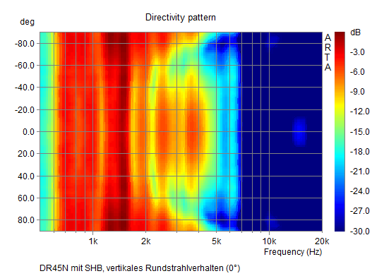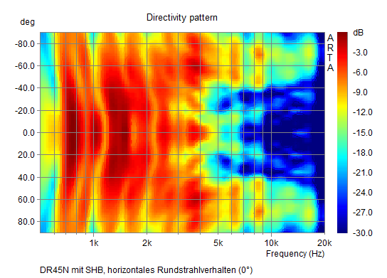 -> kein Constant-Directivity-Verhalten erkennbar; bis 20 kHz sehr breite Abstrahlung mit Einbrüchen unter großen Winkeln von 2.5 bis 5.5 kHz und von 13 bis 16 kHz