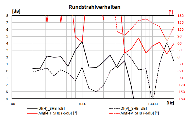 -> relativ geringe Bündelung (besonders vertikal < 2 kHz), ungleichmäßiger Verlauf des Bündelungsgrads