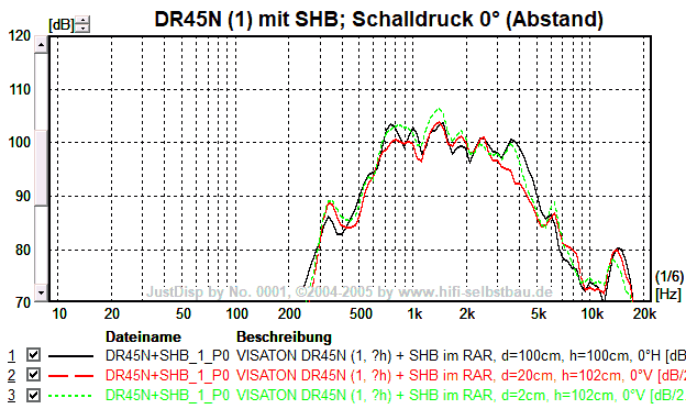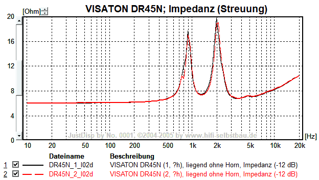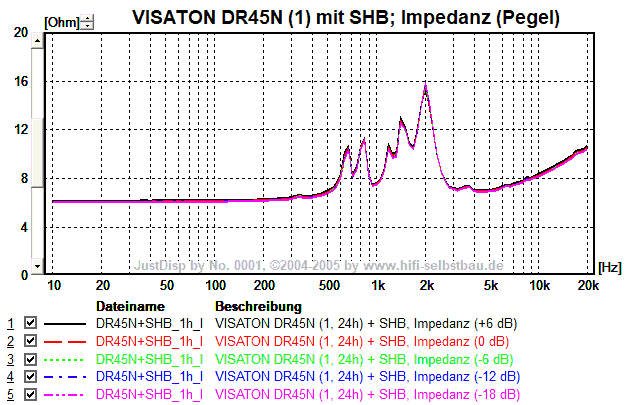 Hier zunächst der Impedanzverlauf des VISATON DR45N ohne und mit dem schwarzen Smith-Horn (kurz: SHB für Smith-Horn Black):