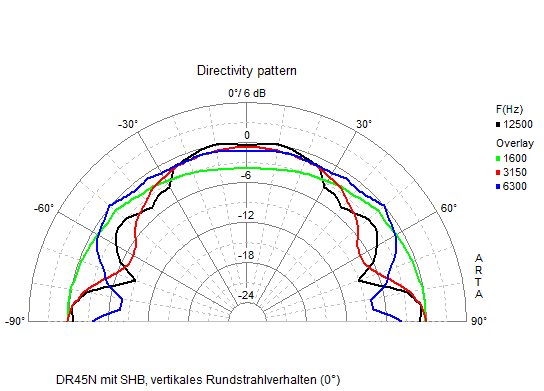 Vertikal ist die Abstrahlung bis 20 kHz sehr breit (bis +/-90° kein Abfall > -6 dB (außer bei 16 kHz)), oberhalb von 4 kHz fällt der winkelgewichtete Schalldruck in vertikaler Richtung aber stark ab.